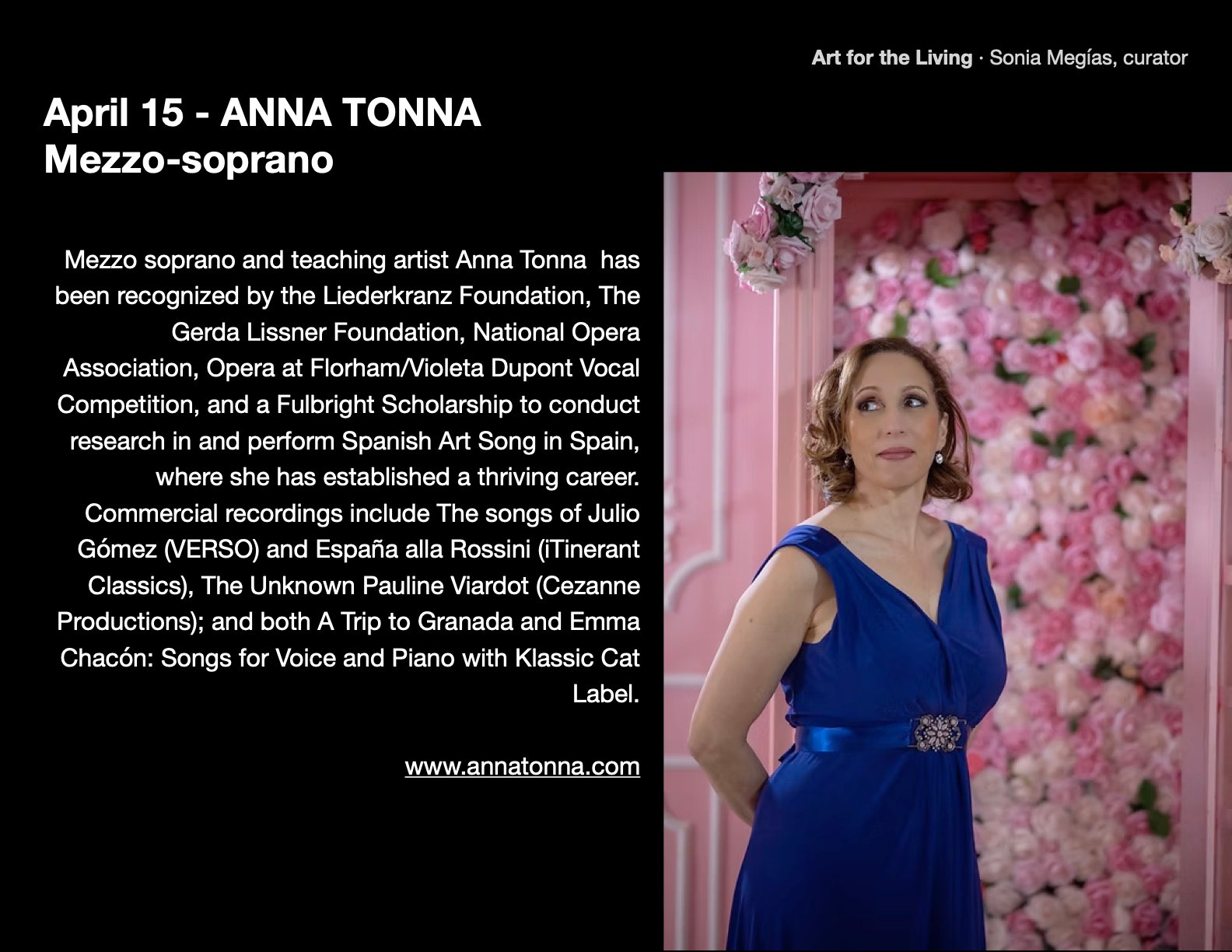 Our fourth guest is mezzo soprano Anna Tonna, who not only sings opera but also contemporary music in the States and in Europe.