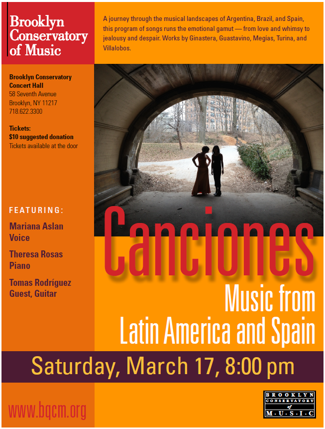 · 2012’III’17: Canciones. Music from Latin America and Spain @ Brooklyn Conservatory of Music. New York (USA). Marina Aslan at the voice and Theresa Rosas at the piano.
