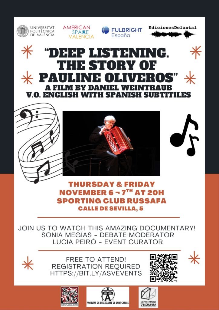 Los días 6 y 7 de noviembre se proyecta en el Sporting Club de Russafa el documental ‘Deep Listening. The Story of Pauline Oliveros’ (Escucha profunda. La historia de Pauline Oliveros) dirigido por Daniel Weintraub. Lo repartiremos en dos sesiones porque, aunque cuenta con subtítulos en castellano, dura dos horas y es mejor hacer debate y ejercicios de escucha tras cada mitad.