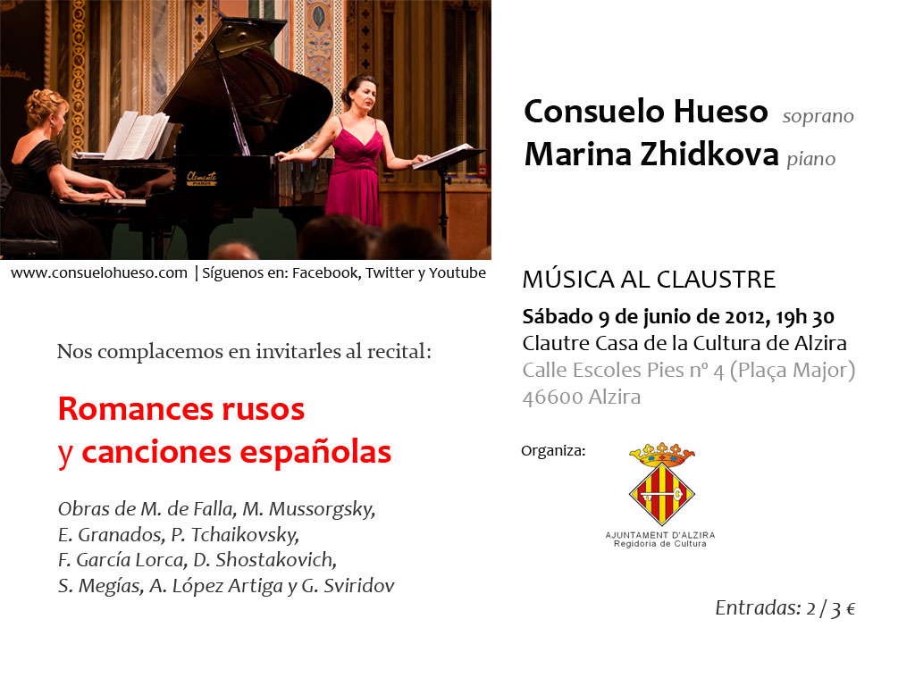 · 2012’VI’9: Romances rusos y canciones españolas en la Casa de Cultura de Alzira (Valencia). Consuelo Hueso a la voz y Marina Zhidkova al piano.