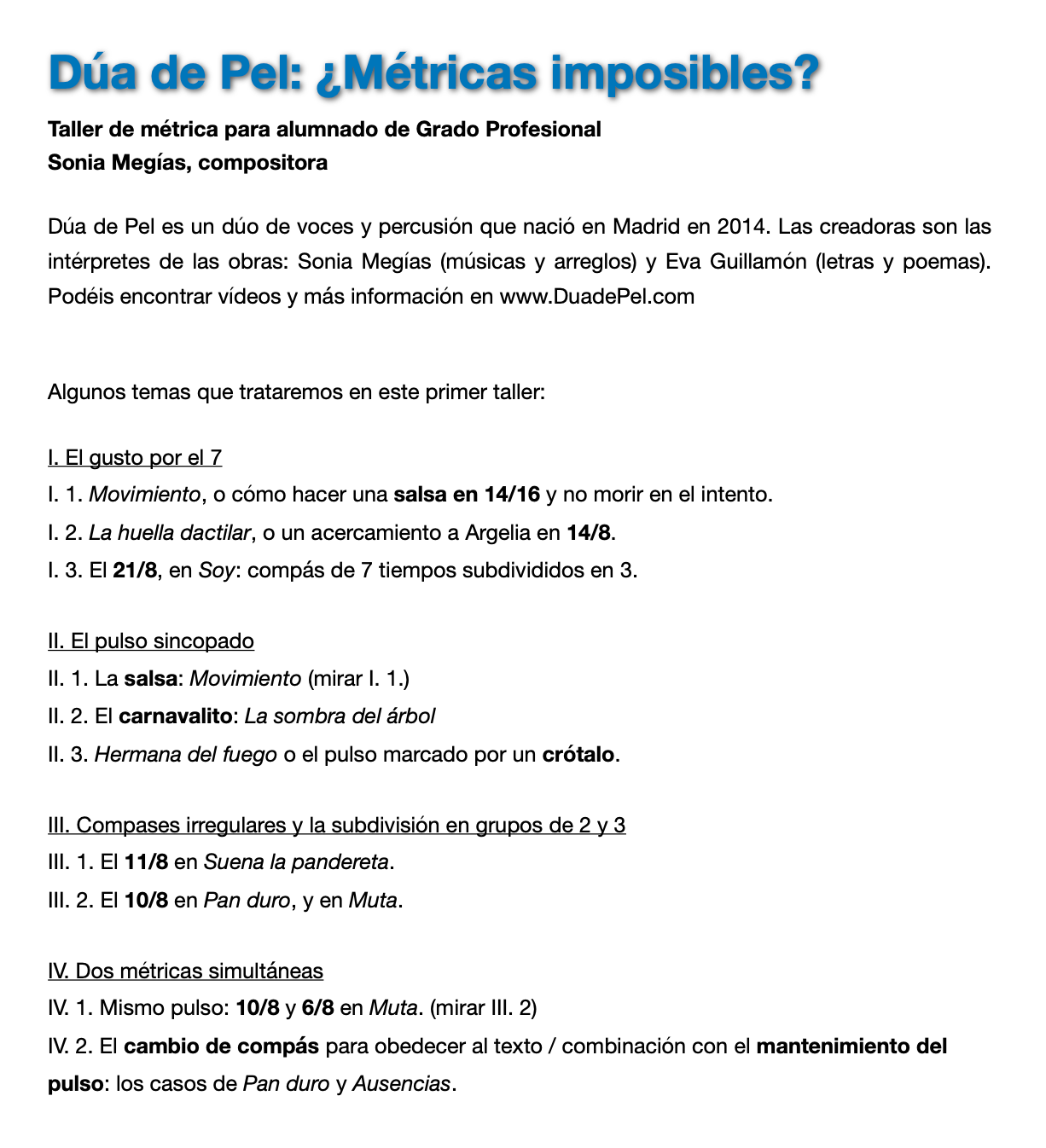 Los Talleres de Métrica están inspirados en las músicas creadas por la autora para el grupo Dúa da Pel, del cual forma parte desde 2014.