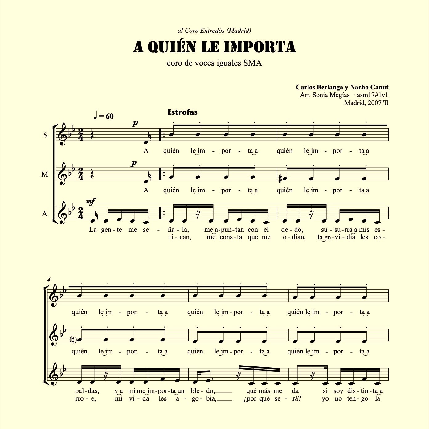 Vídeo de estudio para la voz de MEZZOSOPRANO de la canción A quién le importa, escrita por Nacho Canut y Carlos Berlanga, en su versión de coro a 3 voces iguales SMA.